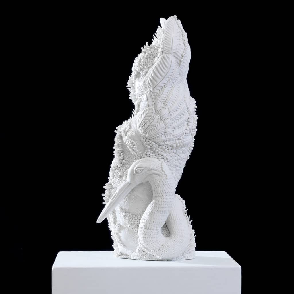 Ostermann’s sculptures examine the fragility of ecosystems and the devastating impact of environmental destruction. Her art juxtaposes the delicate beauty of nature against the irreversible harm being inflicted upon it. Through a combination of hand-built ceramic, fiber and illustration, Ostermann meticulously constructs intricate representations of birds entwined in their decaying habitats. Each piece is carved with painstaking detail—every feather, bill and talon a tribute to the beauty of the natural world, yet burdened by nodes of flora, fungi and coral, symbolizing ecological succession.